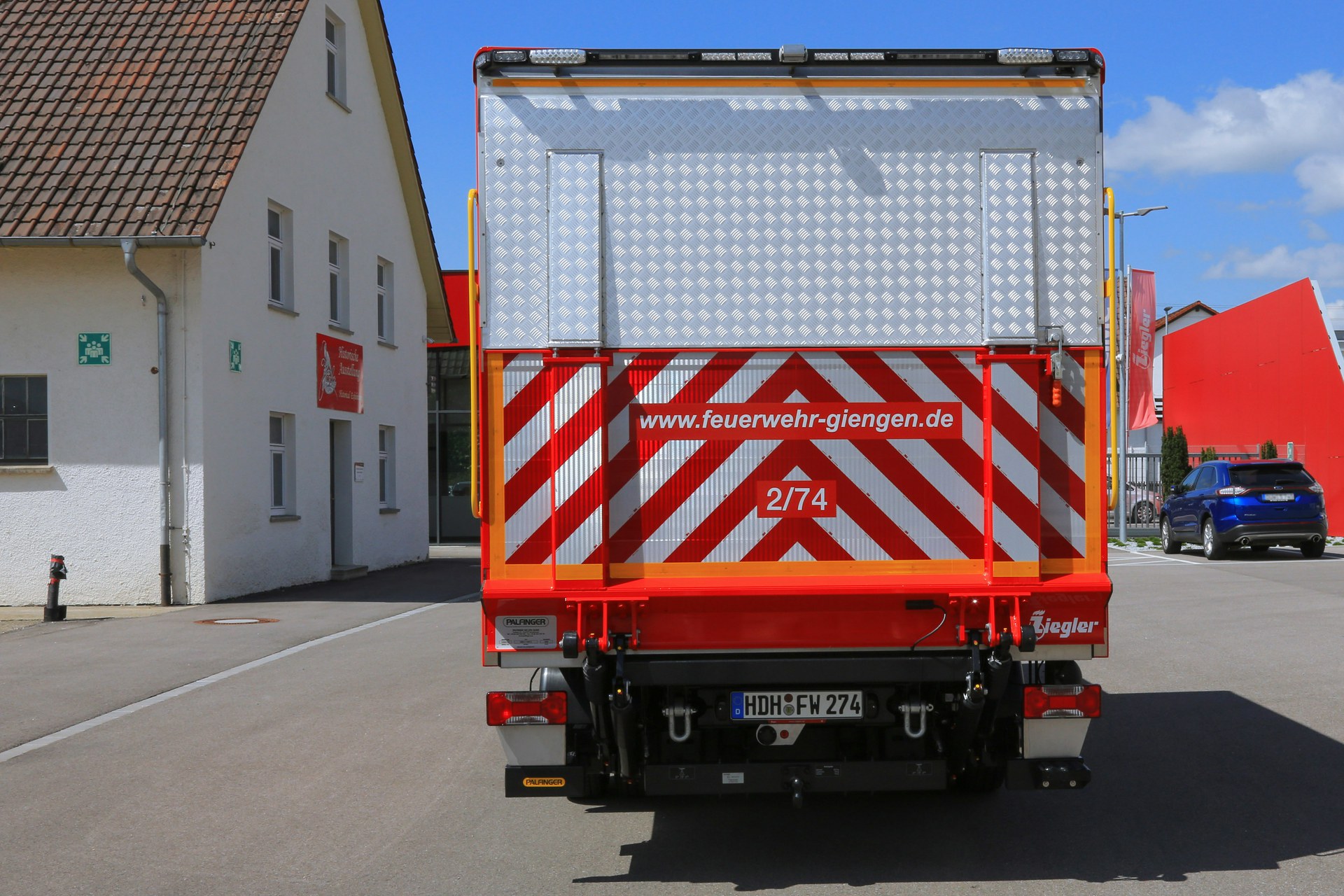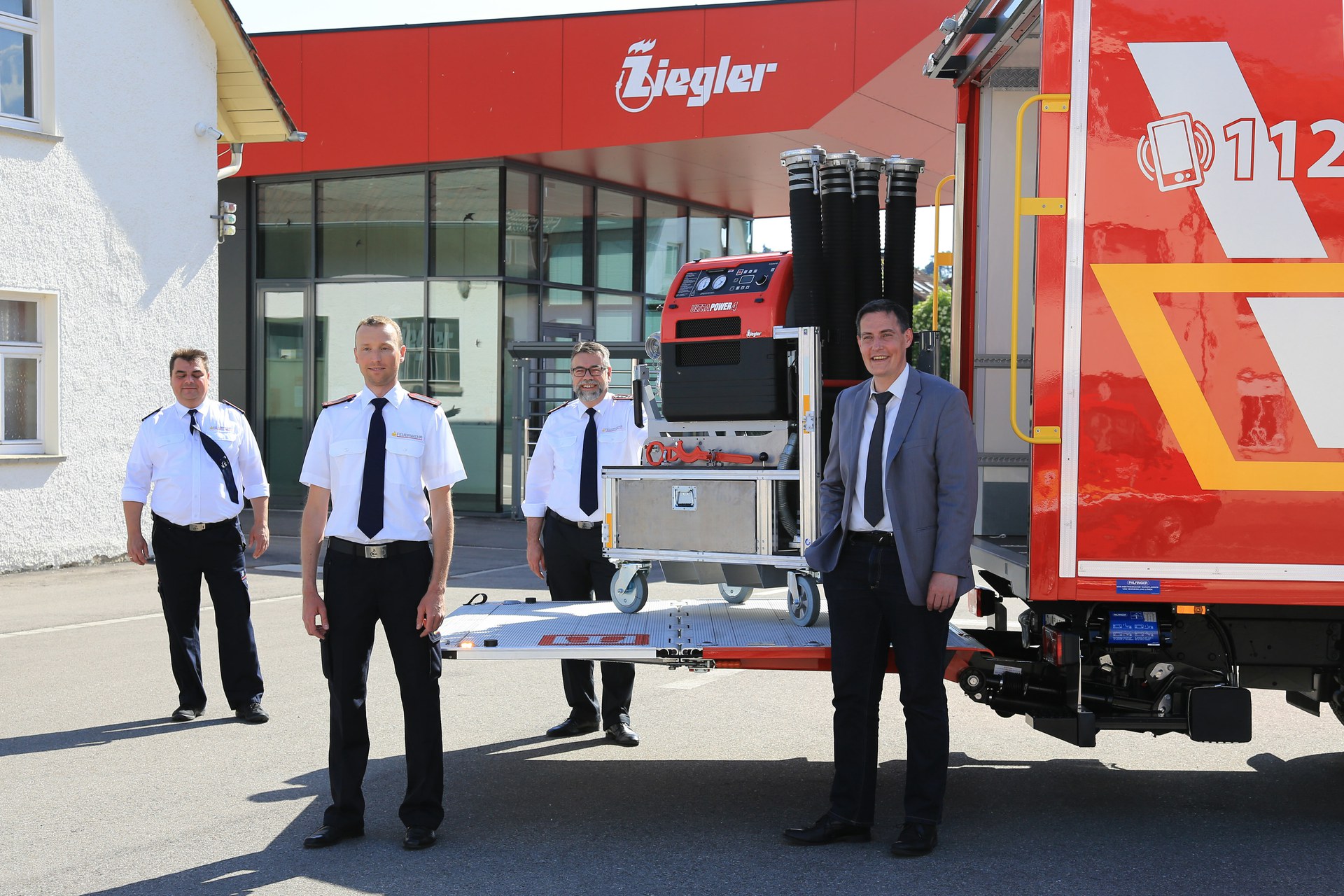 Die Freiwillige Feuerwehr Giengen erhält ein neues Feuerwehrfahrzeug von der ortsansässigen Albert Ziegler GmbH. Am „Nationalfeiertag“ der großen Kreisstadt Giengen an der Brenz, dem 2. Juni 2020, übergab die Albert Ziegler GmbH in Giengen den neuen Gerätewagen Logistik (GW-L 1) an die Feuerwehr. Um ihre vielfältigen Aufgaben zu erfüllen, benötigen Feuerwehren immer mehr Ausrüstungsgegenstände und Geräte, die nicht in den herkömmlichen Löschfahrzeugen untergebracht werden können. Mit dem Gerätewagen Logistik steht der Feuerwehr nun ein Fahrzeug zur Verfügung, das zum einen über ein großes Volumen im Laderaum verfügt, zum anderen ein Systemregal im Laderaum für feuerwehrtechnische Beladung bietet. Auf der Ladefläche können bis zu 6 Rollcontainer verlastet werden. Auf einem Rollcontainer ist die ZIEGLER Tragkraftspritze Ultra Power 4 verlastet, die ebenfalls neu geliefert wurde.