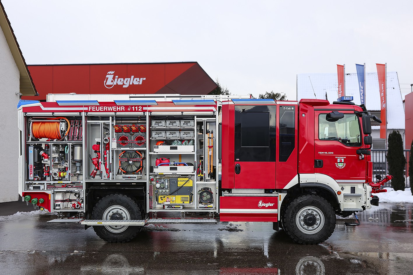 The vehicles, that are based on a MAN TGM 18.320 chassis with a wheelbase of 4,200 mm, are equipped with a 4,000 l water and a 150 l foam tank. Additionally, they are equipped with an Alco roof turret as well as an electrically remote controlled ZIEGLER front turret VIPER. The roof turret can be used to dispense either water or foam, and the front turret can be used to dispense water.