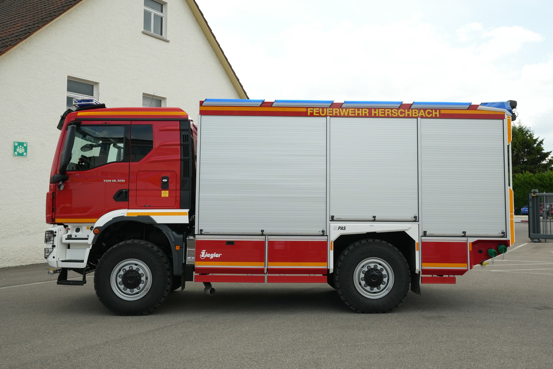 The six identical vehicles are built on a MAN TGM 18.320 chassis. Thanks to single tires and a wading capacity of up to 800 mm, the vehicles can also be used to fight forest fires and in flood situations. The 4,000 l of extinguishing water and the additional 500 l of foam agent mean that fire departments are now ideally equipped for efficient firefighting.