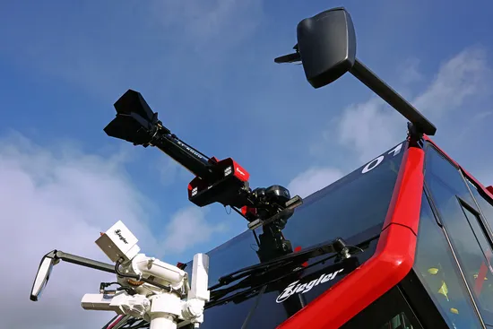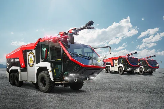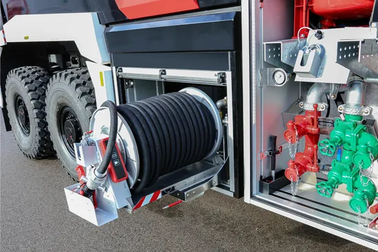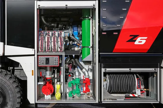 The three identical vehicles are built on a TITAN 6×6 chassis and are equipped with a 750 HP Scania V8 engine. Kessler's innovative continuously variable transmission achieves best-in-class acceleration (0 to 50 mph in about 28 seconds) and top speed (up to 81 mph). The vehicles are also equipped with a 12,500 liter extinguishing water tank, a 1,500 liter foam agent tank and 250 kg of extinguishing powder. With the newly developed roof-mounted ZT-6000, the extinguishing agent can be applied at 6,000 l/min.