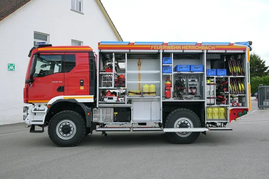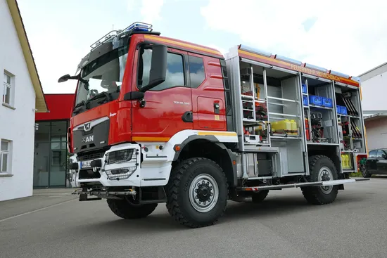 The six identical vehicles are built on a MAN TGM 18.320 chassis. Thanks to single tires and a wading capacity of up to 800 mm, the vehicles can also be used to fight forest fires and in flood situations. The 4,000 l of extinguishing water and the additional 500 l of foam agent mean that fire departments are now ideally equipped for efficient firefighting.